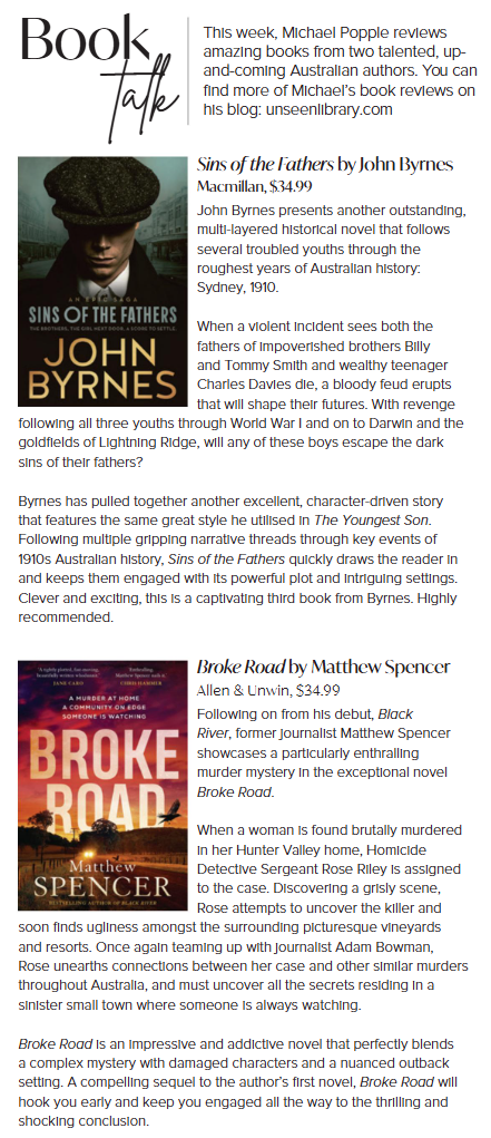 Byrnes is a relatively new Australian author whose work I have been rather enjoying in recent years. Byrnes career started back in 2023 with his cool thriller Headland, a compelling modern crime fiction novel with some interesting dramatic twists around it. Headland ended up being one of my favourite debuts of 2023, and I made sure to read his next novel, the historical saga The Youngest Son (one of my favourite Australian novels of 2024). It looks like Byrnes intends to continue his focus on Australian historical epics going forward, as his third book was the intriguing and exciting novel from last year, Sins of the Fathers, which followed several compelling characters through several major events of the 1910s.
